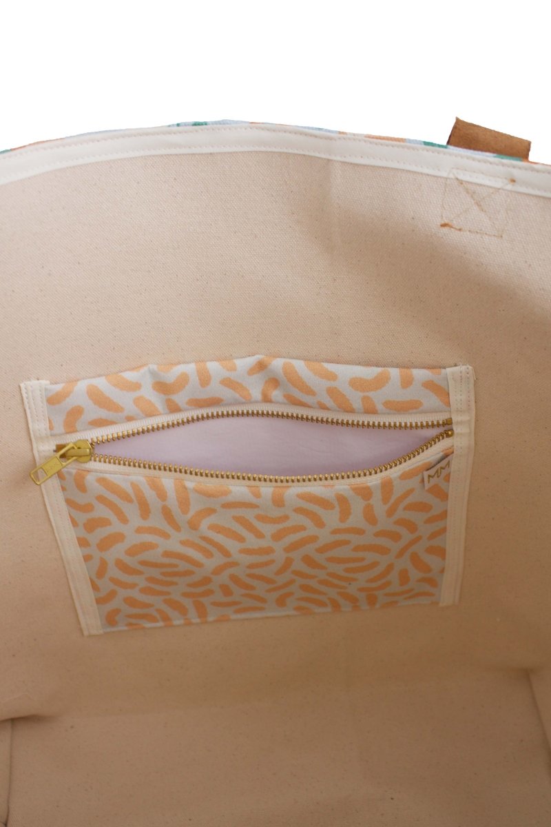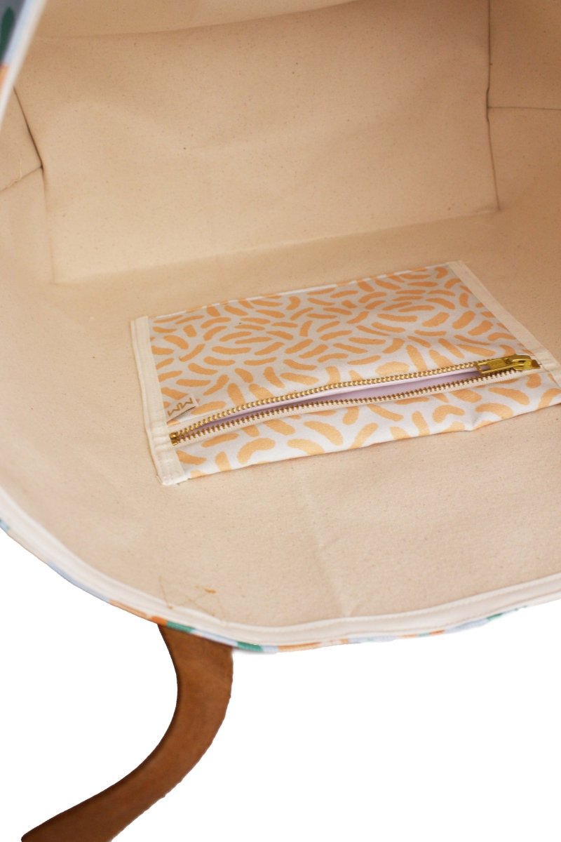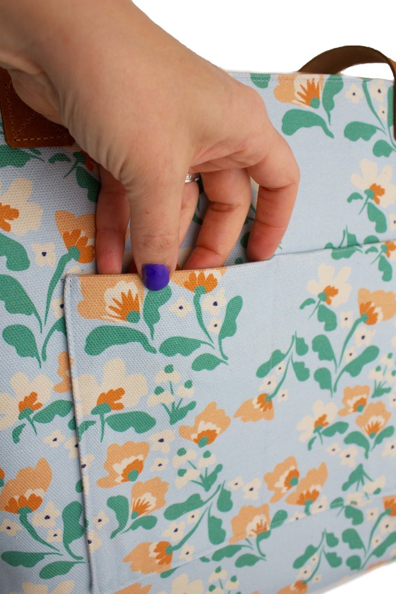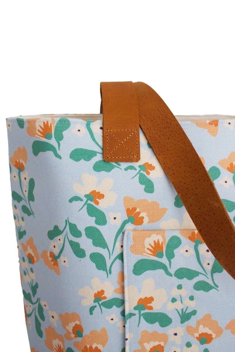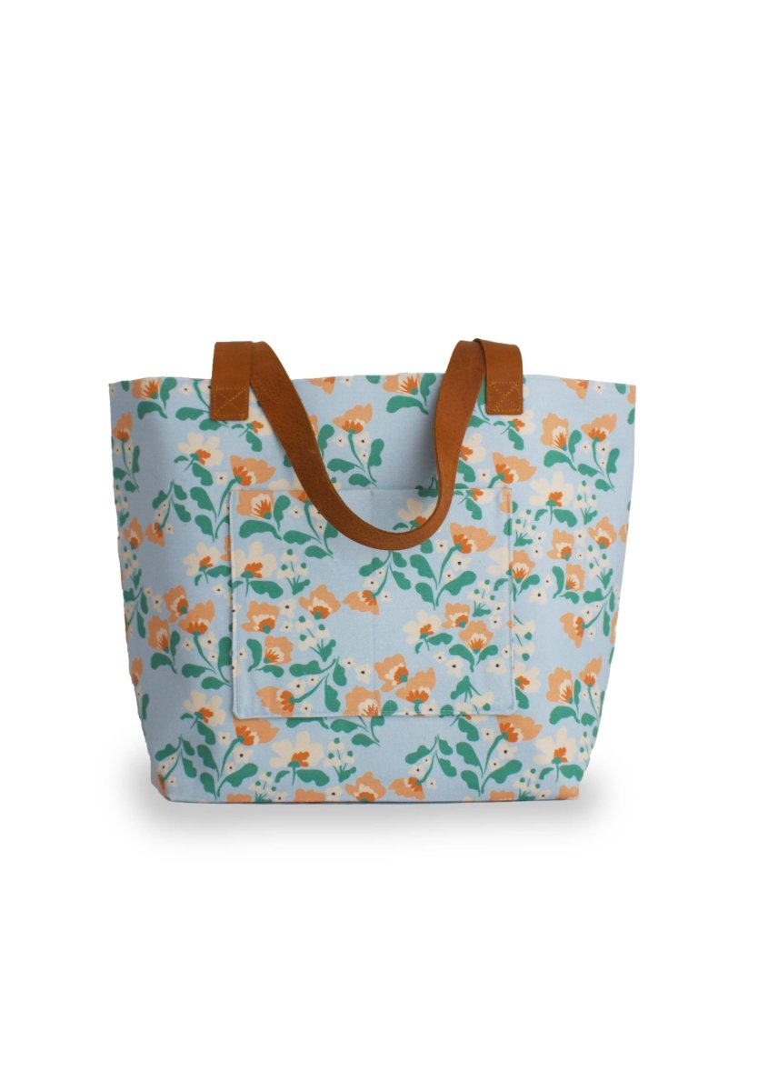 The Sunny Meadow Everyday Tote is a breath of fresh air—full of color, charm, and function. This exclusive Modern Makerie floral features soft blues, warm tangerine, and creamy neutrals in a playful but refined pattern that works year-round. Finished with genuine cognac leather straps, she’s sturdy enough for work, errands, or life on the go.