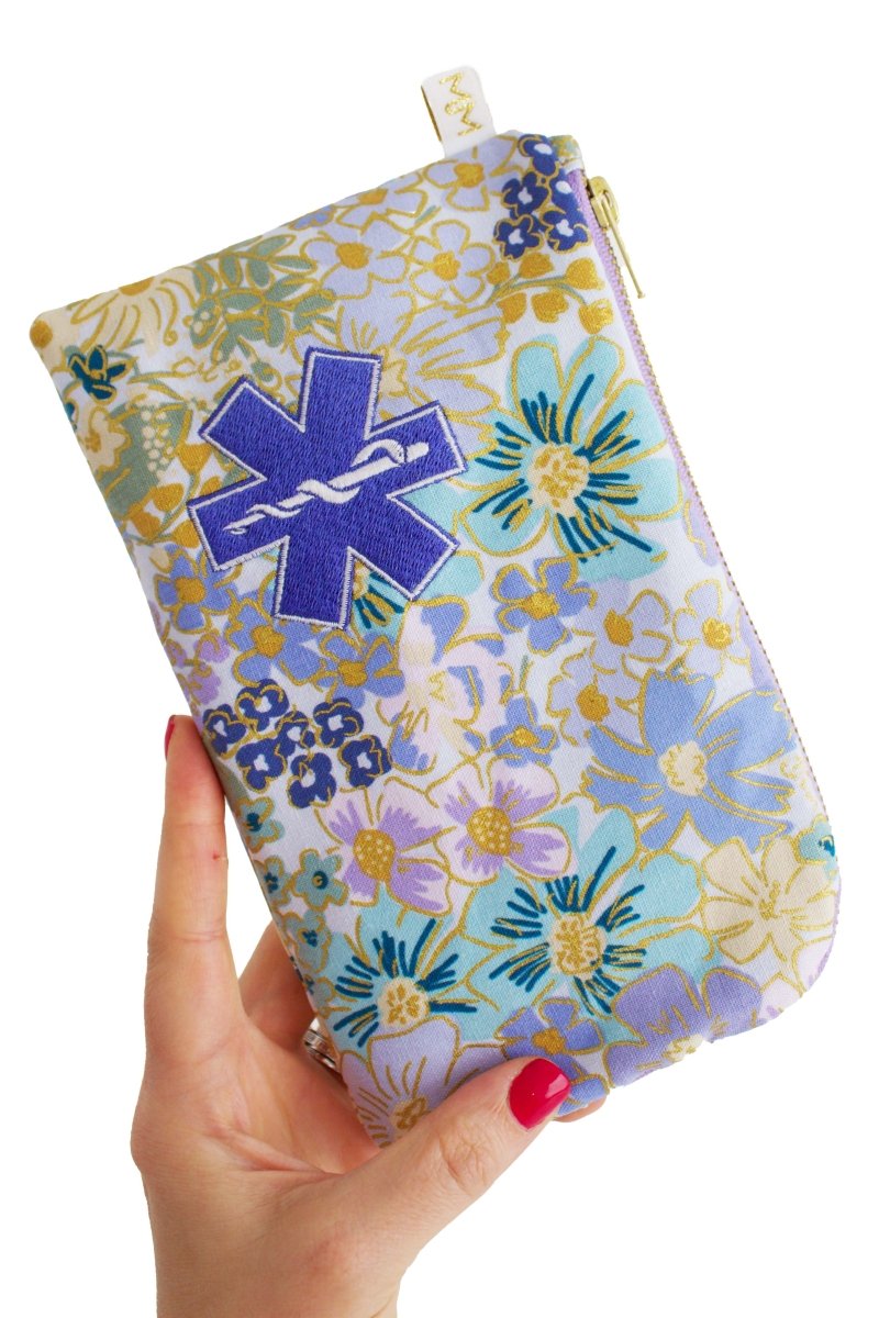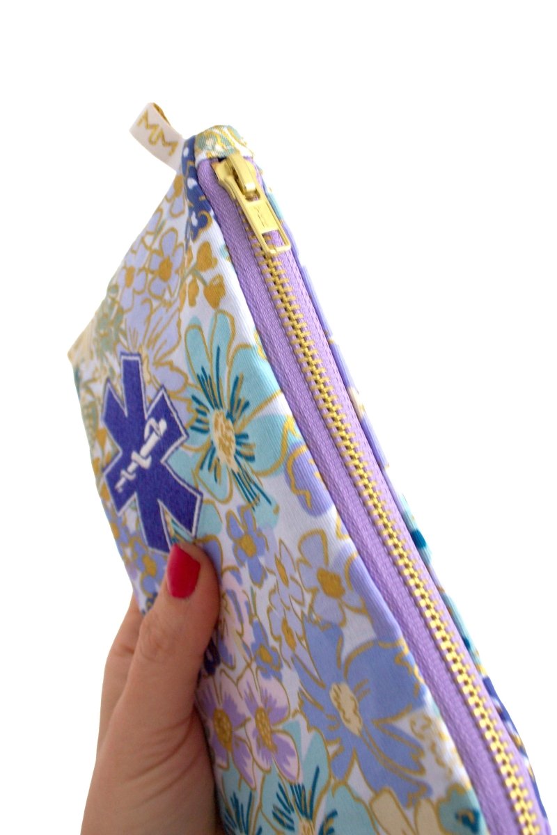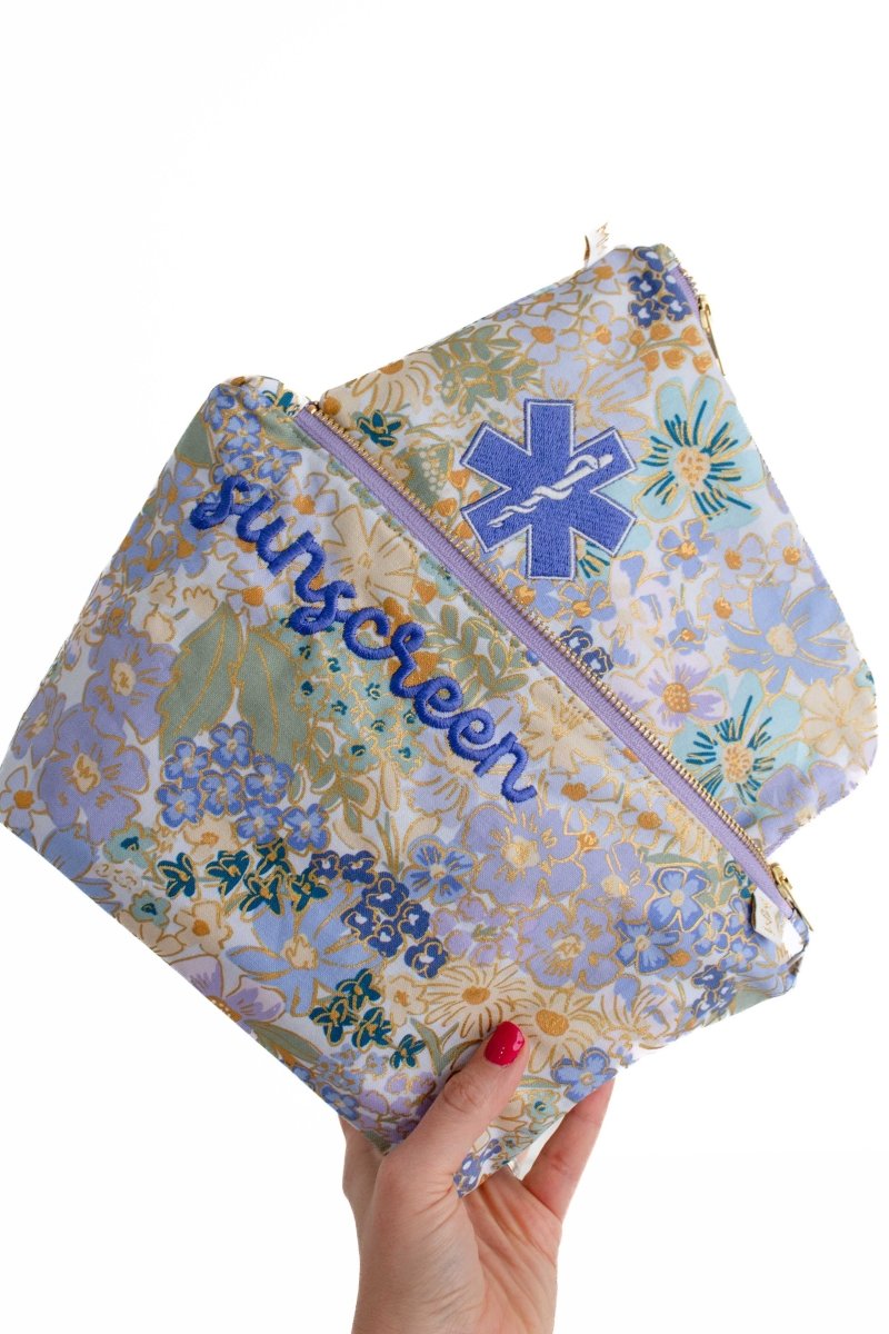 Hand holding a Mini Maxx pouch in Rifle Paper Co. Sage Garden canvas with “You’re So Lovely” embroidery in periwinkle thread