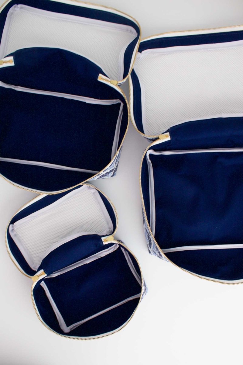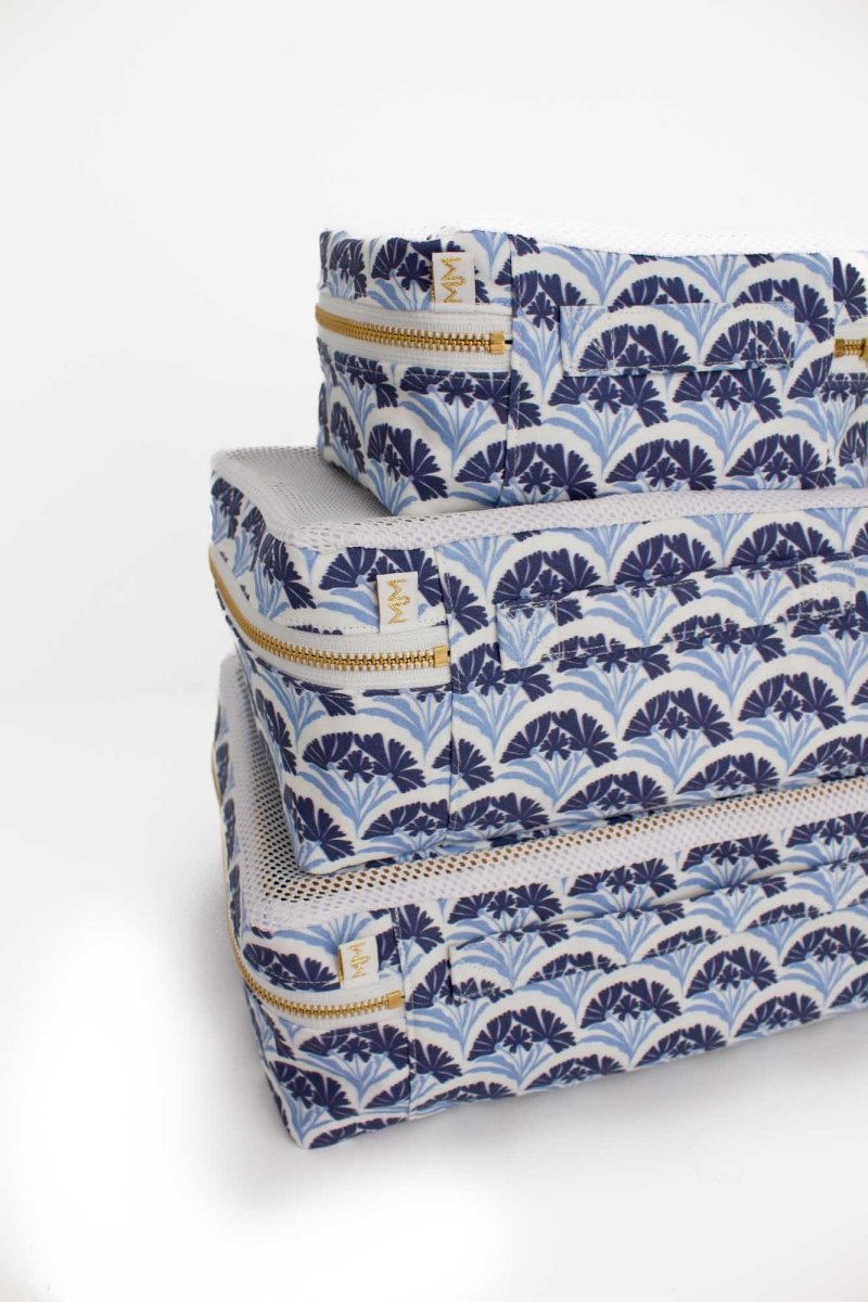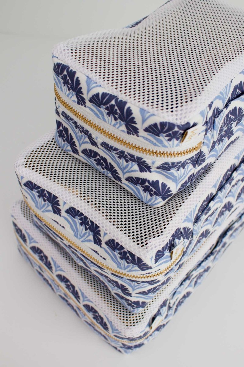 Organized never looked so pretty. This 3-piece packing cube set is made from Kate's custom designed art deco inspired scallop—a soft and serene floral in shades of light blue, navy, and white, finished with crisp white mesh tops.