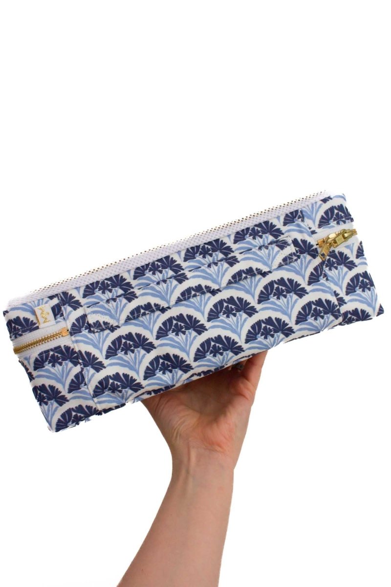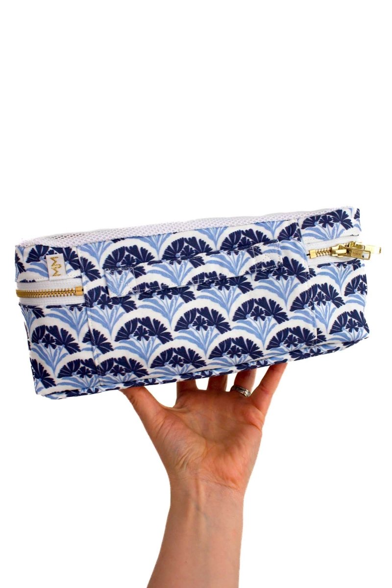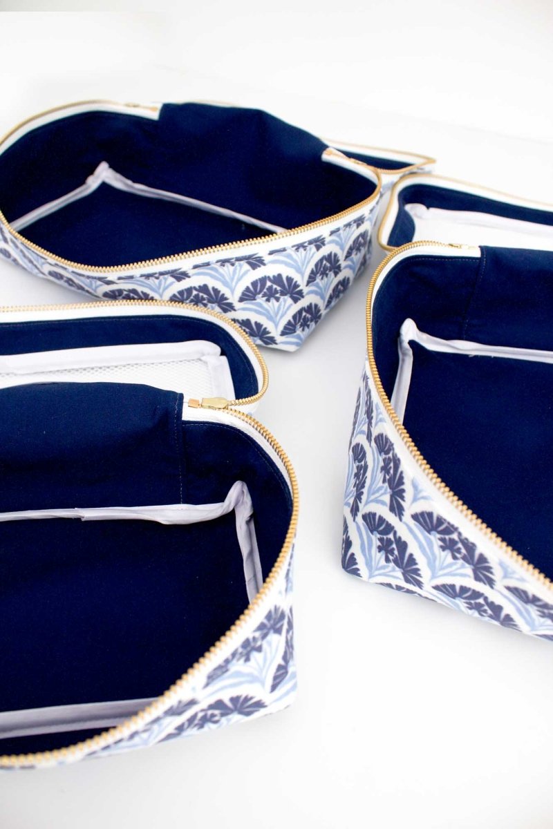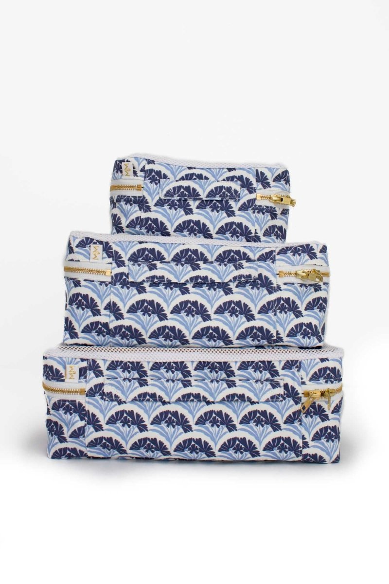 Organized never looked so pretty. This 3-piece packing cube set is made from Kate's custom designed art deco inspired scallop—a soft and serene floral in shades of light blue, navy, and white, finished with crisp white mesh tops.