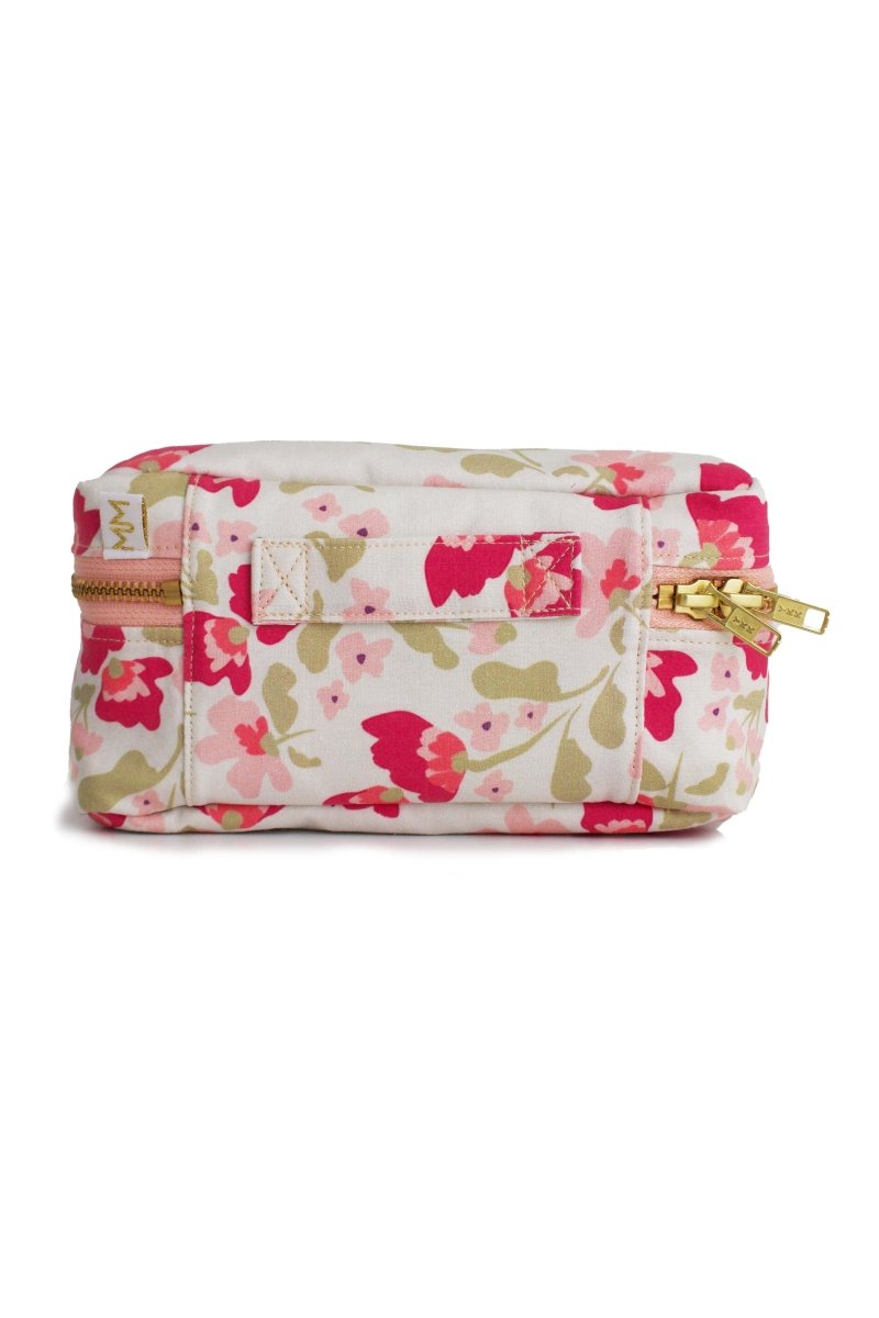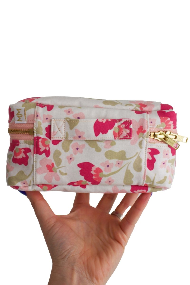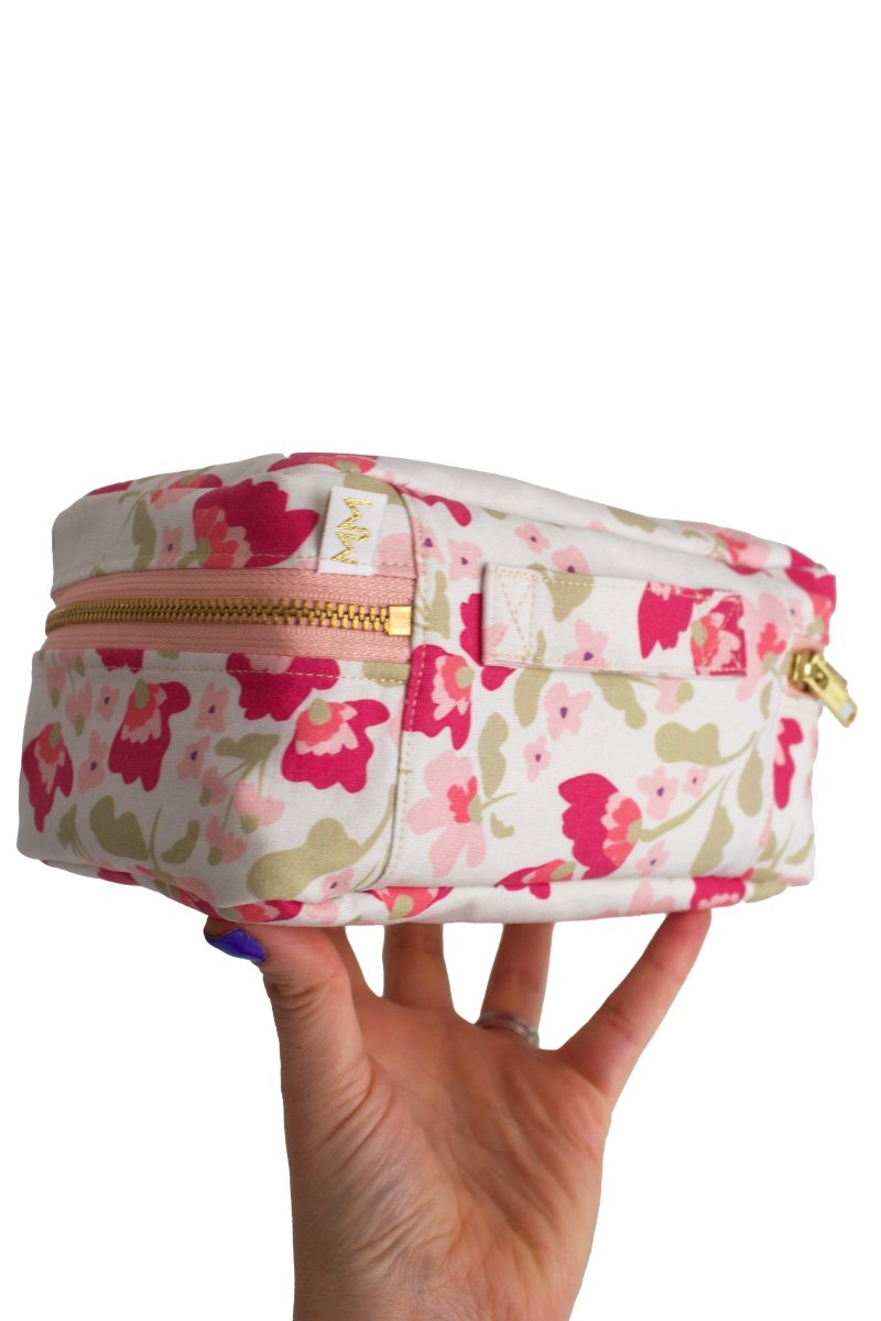 The Sunny Meadows Wildflower Mini Leak-Proof Cube is a compact makeup and toiletry bag designed for real life—where spills happen and beauty routines don’t stay put. Lined in fully wipeable oilcloth and built with 4 elastic brush loops in the lid, she keeps concealer, mascara, and brushes right where you want them.